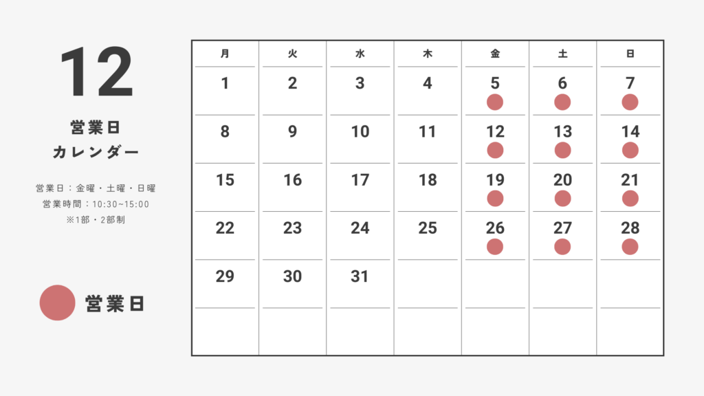 🎉 12月営業日スケジュール(毎週 金・土・日)