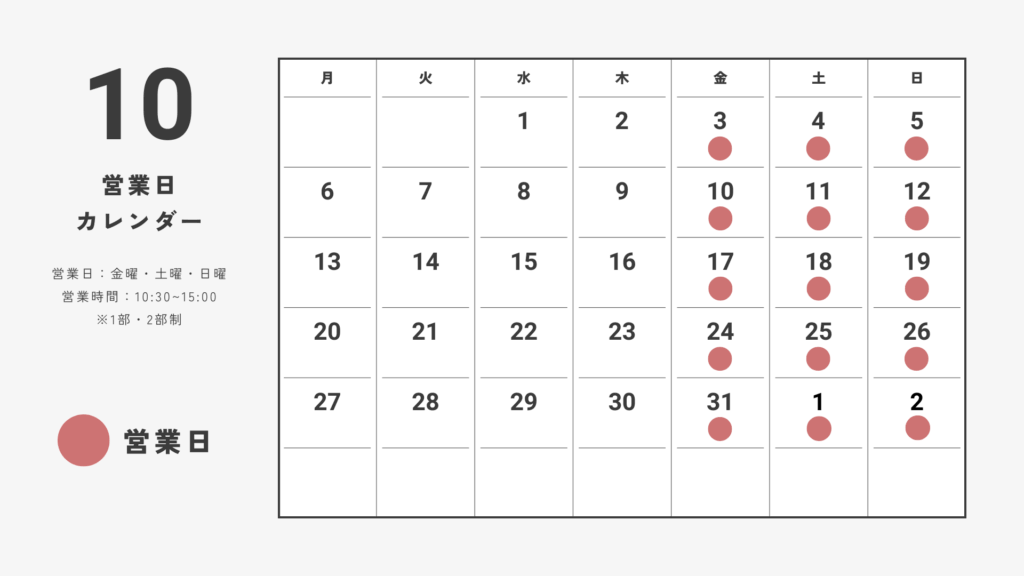 10月も変わらず、金・土・日曜日のみ営業いたします。