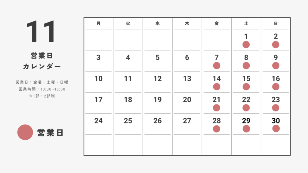 11月も変わらず、金・土・日曜日のみ営業いたします。